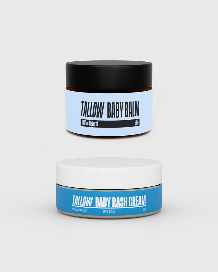A gentle and effective daily care bundle made for delicate baby skin. The Baby Balm provides soft, nourishing moisture to protect against dryness, while the Tallow Baby Rash Cream helps soothe irritation, redness, and diaper rash quickly. Free from fragrances, chemicals, and toxins.